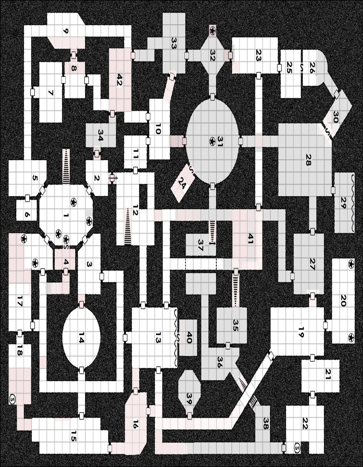 [35] MONSTER Both doors are locked. Tarrent and Nogrod (see #36) each have a key that fits both doors. Forcing the western door from room #41 will likely result in a tumble down the stair.