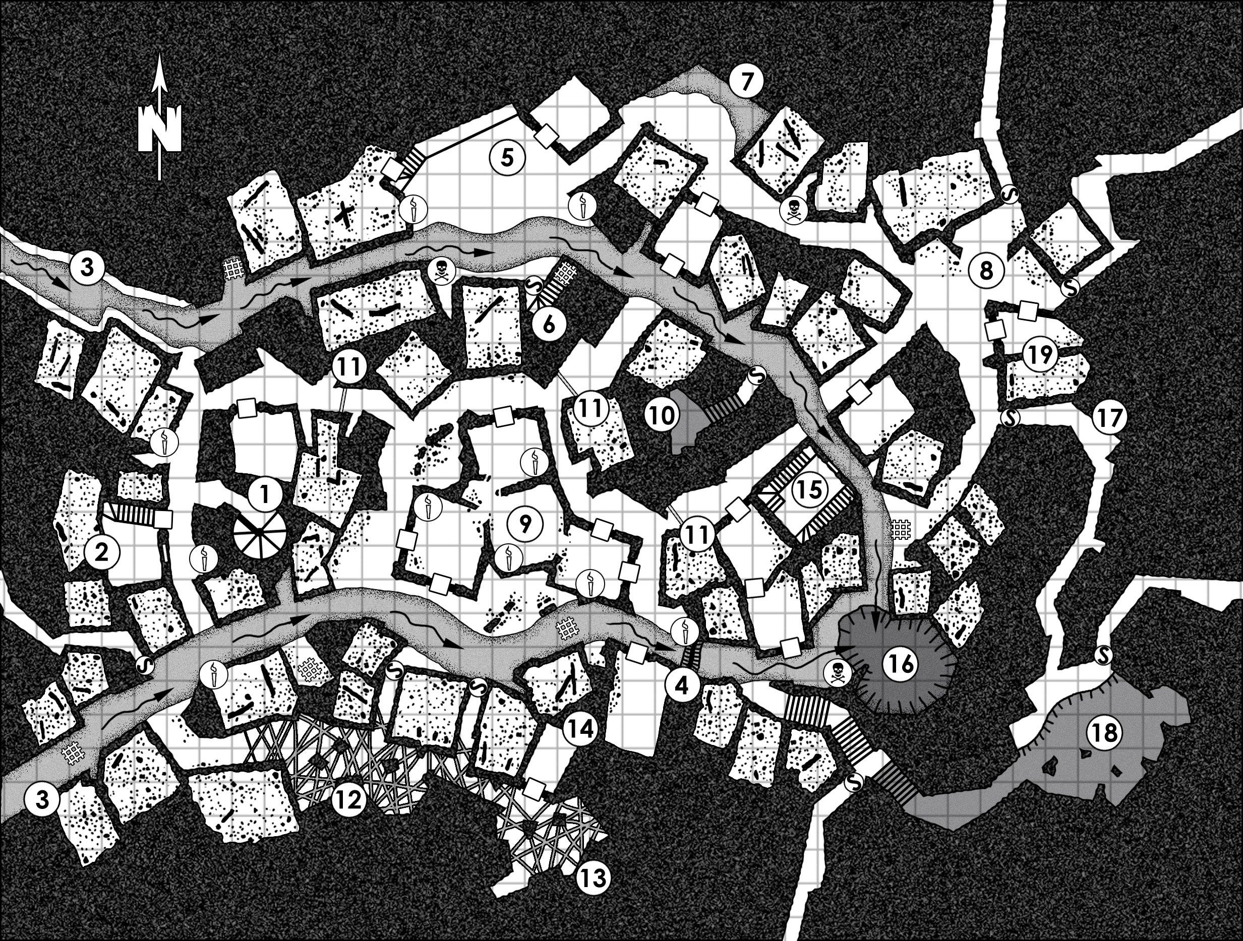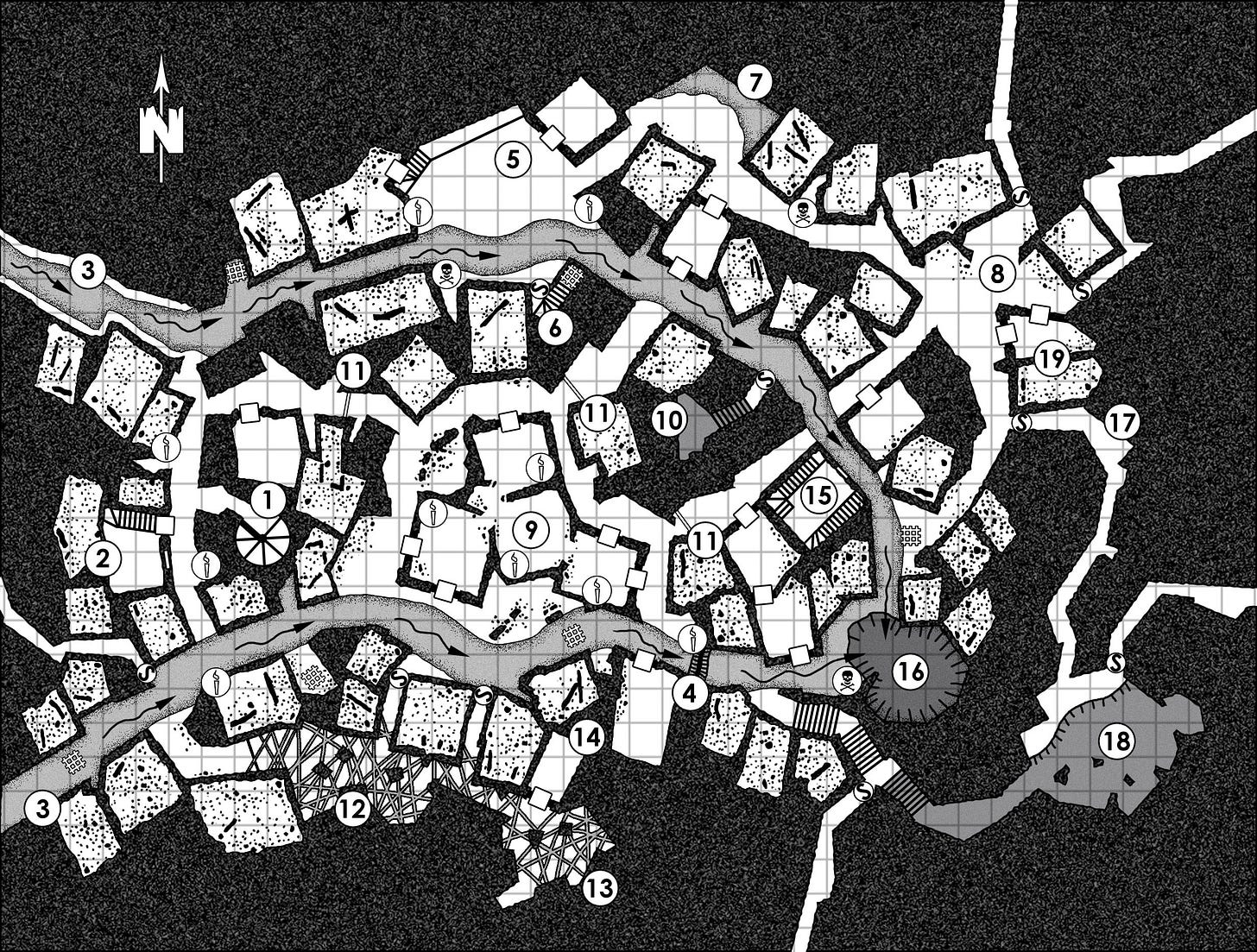 [4] SUBMERGED PIT TRAP The ledges are badly broken hereabouts. A number of slippery stepping stones may tempt explorers; however, hidden beneath the filthy runoff is a 10ft deep, 7ft wide fissure. Anyone slipping into it will vanish into the foul thick muck and risk drowning.